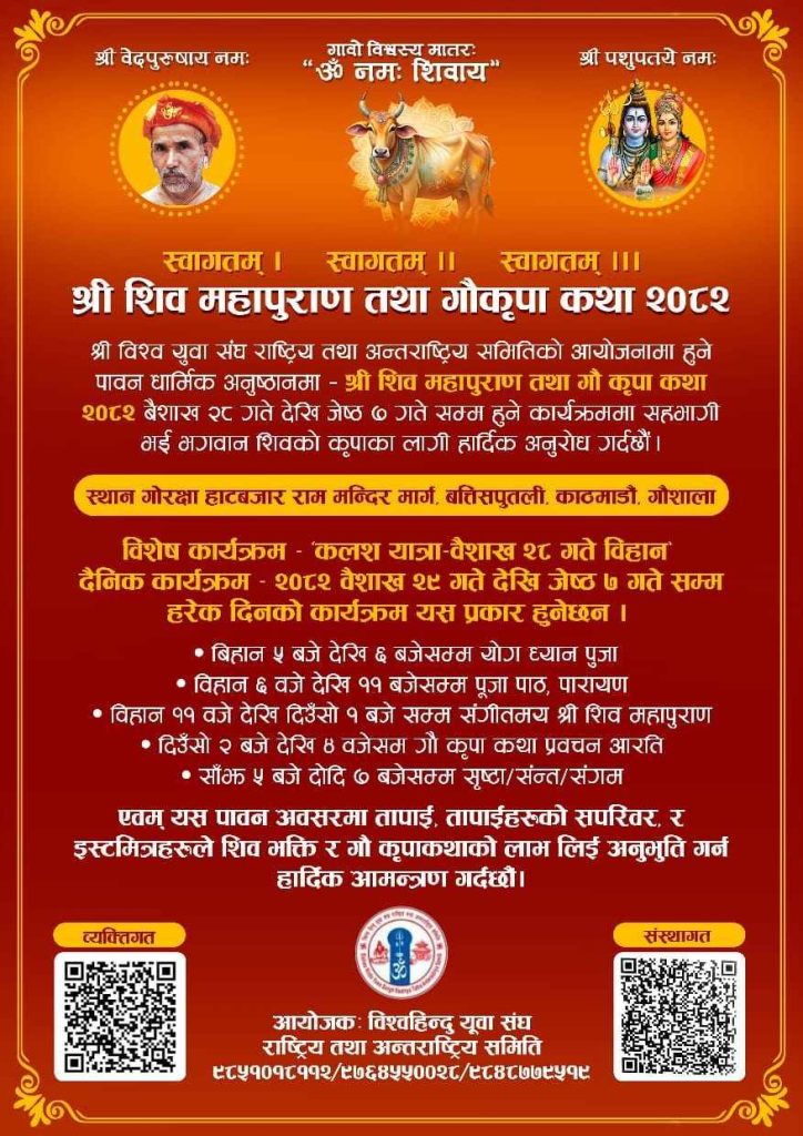 काठमाडौँ । विश्व हिन्दु महासँघकाे शुभेच्छुक संस्था विश्व हिन्दू युवा संघ राष्ट्रिय तथा अन्तरराष्ट्रिय समितिले यही वैशाख २८ गतेदेखि जेठ ७ गतेसम्म काठमाडाैंकाे बत्तीसपुतली स्थित गाेरक्ष हाटबजारमा श्री शिव महापुराण तथा गौकृपा कथा २०८२ आयोजना गर्ने भएको छ ।